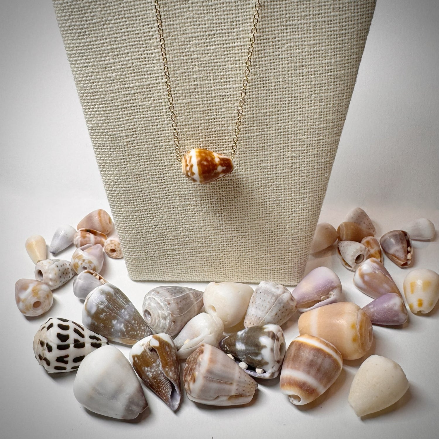 Brown with white Cone 15mm seashell floating on a 17 1/2” gold chain. Perfect for the simple minimalist jewelry wearer’s found on the beaches in Hawaii. Every shell is so beautifully different with its own imperfections.