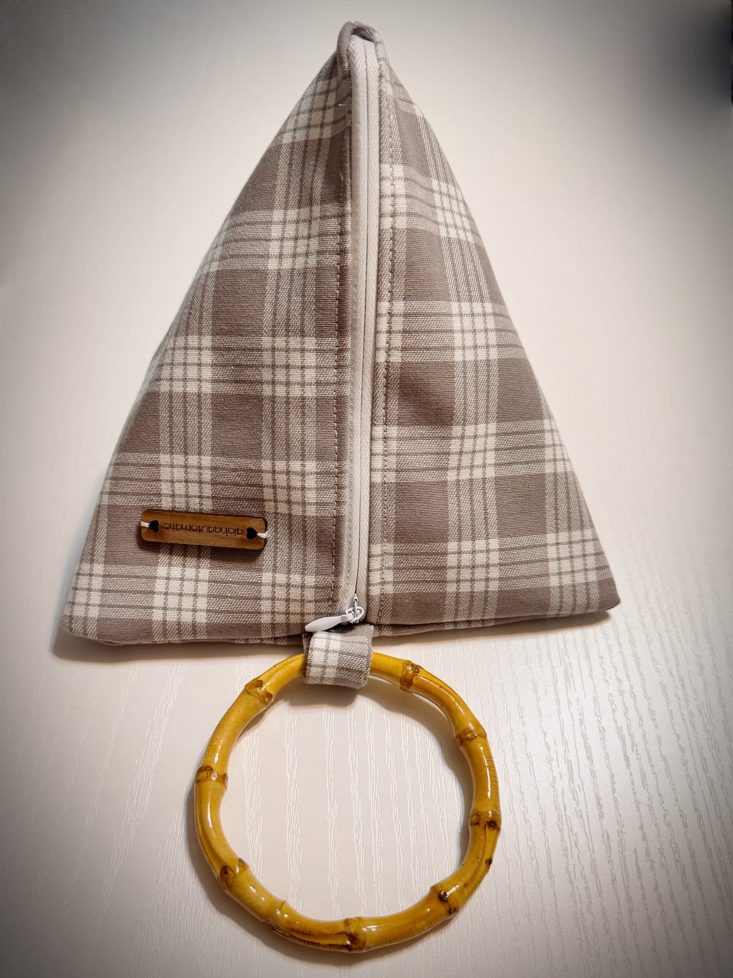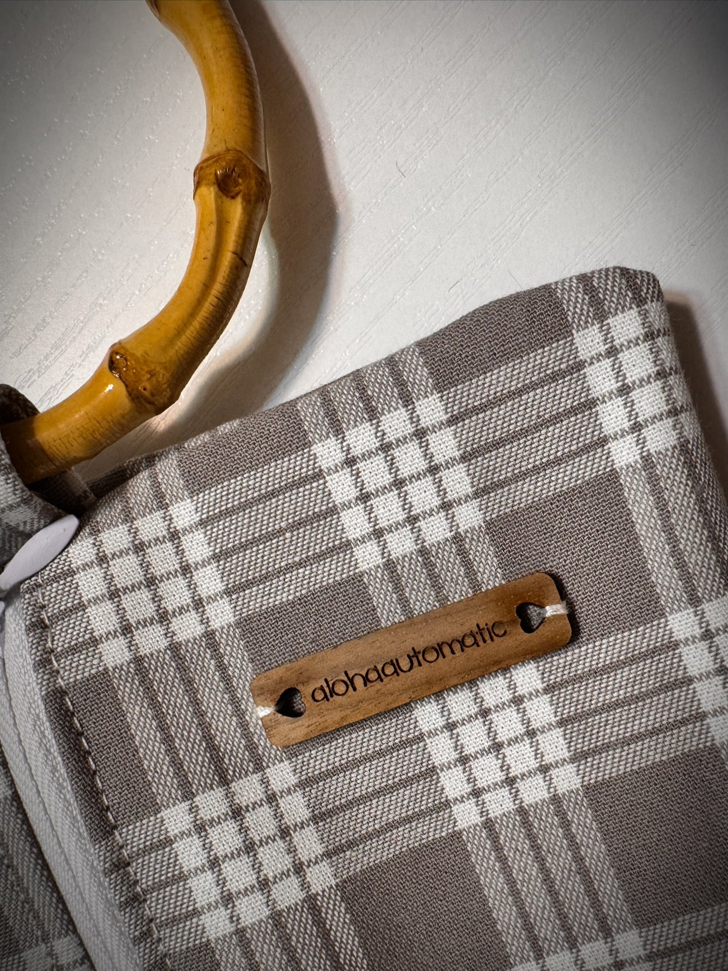 Gray Palaka print zip clutch with a bamboo handle perfect for a young teen to carry her personal hygiene products discreetly to the bathroom at school or your on the go trips enough to fit a phone set of keys and a credit card. This is Pasha’s famous little sack that was donated to middle school girls around Polynesia.