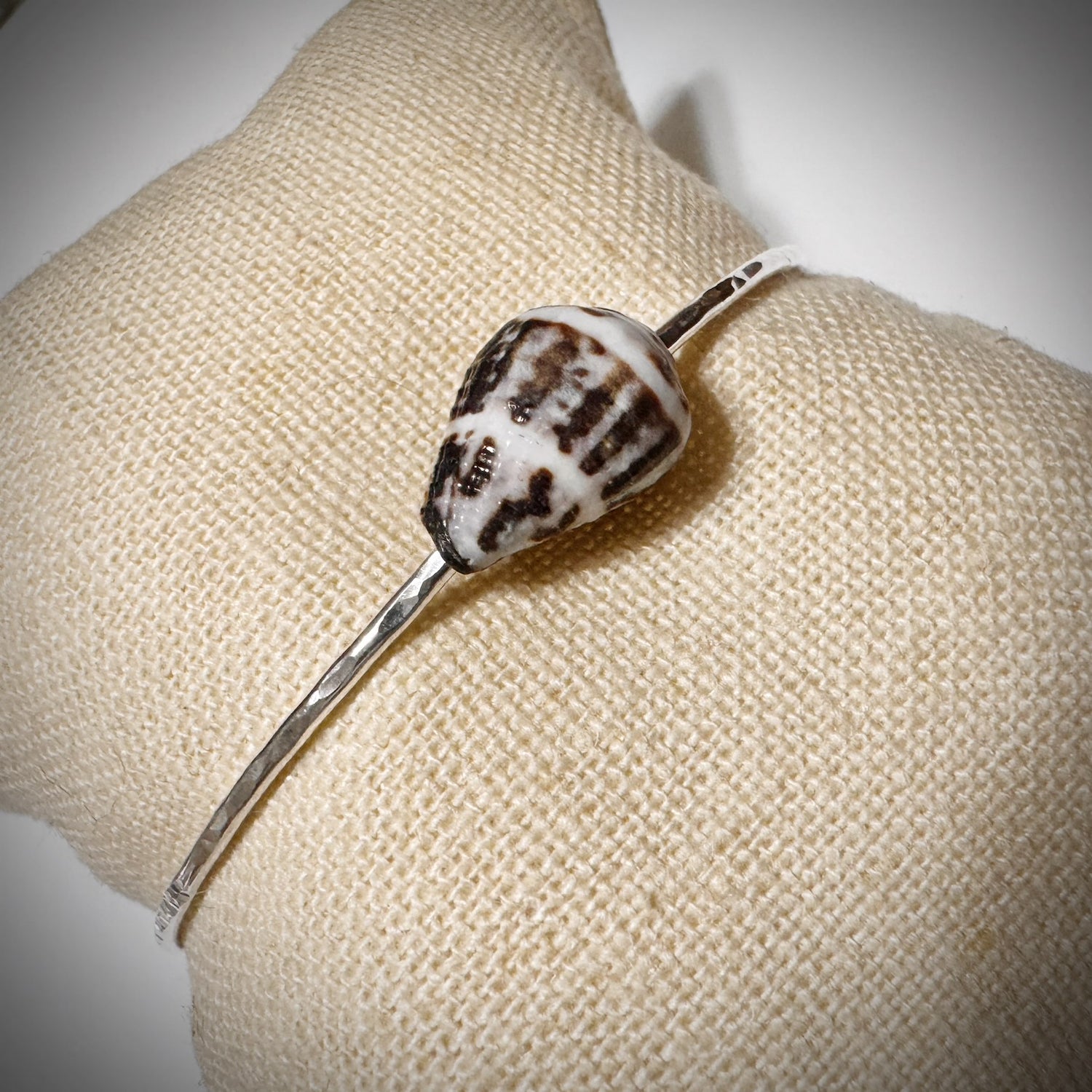 Blackish brown with white Cone 1“ seashell floating on a size 8 1/4 silver bangle. Perfect for the simple minimalist jewelry wearer’s found on the beaches in Hawaii. Every shell is so beautifully different with its own imperfections.