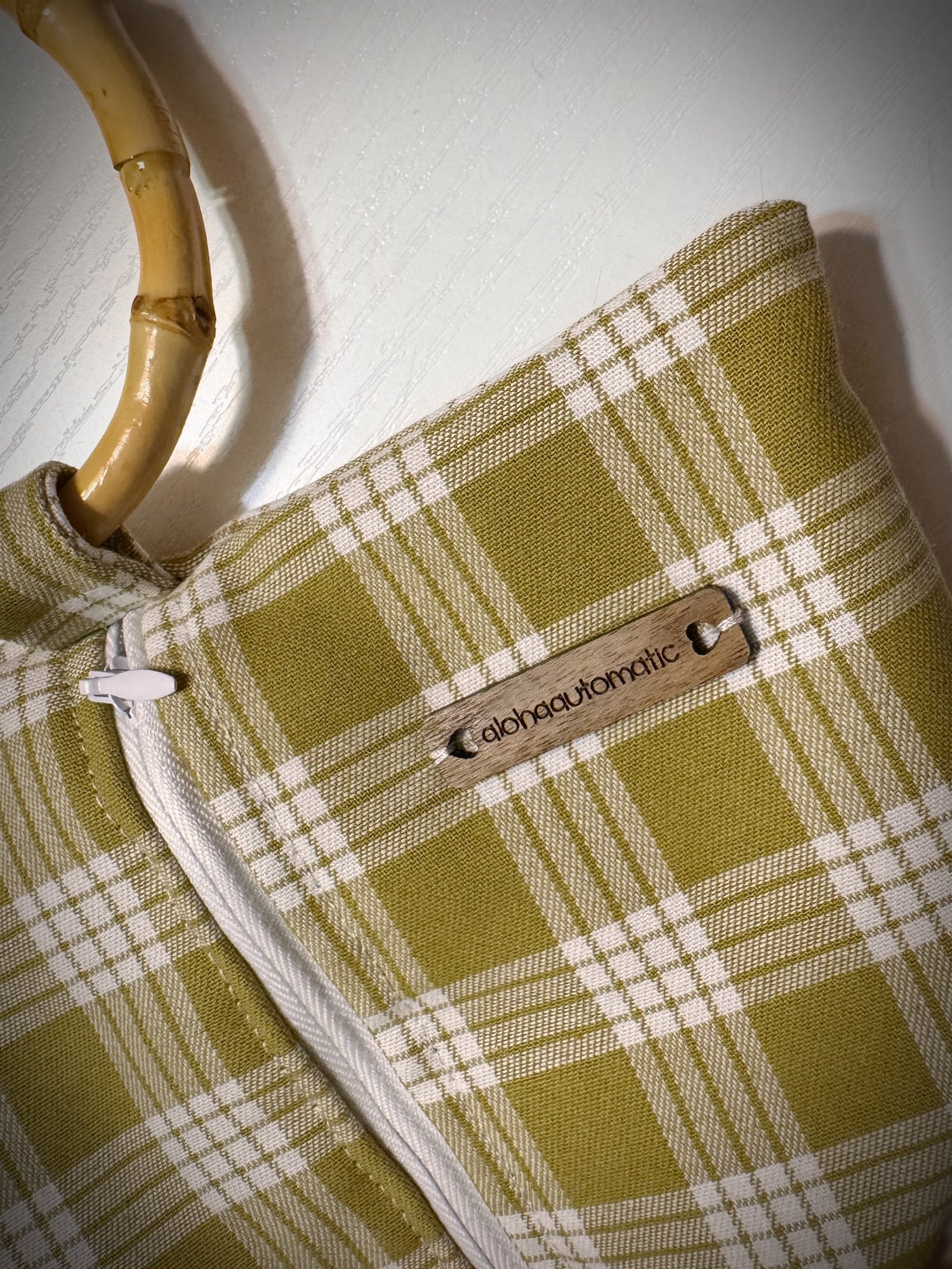 Olive Palaka print zip clutch with a bamboo handle perfect for a young teen to carry her personal hygiene products discreetly to the bathroom at school or your on the go trips enough to fit a phone set of keys and a credit card. This is Pasha’s famous little sack that was donated to middle school girls around Polynesia.