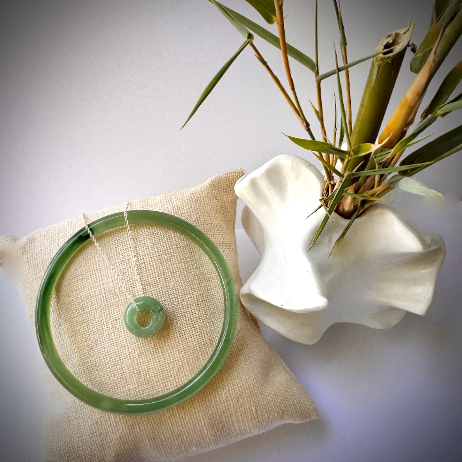 Jade dainty bangle and doughnut shape pendant set-mix green