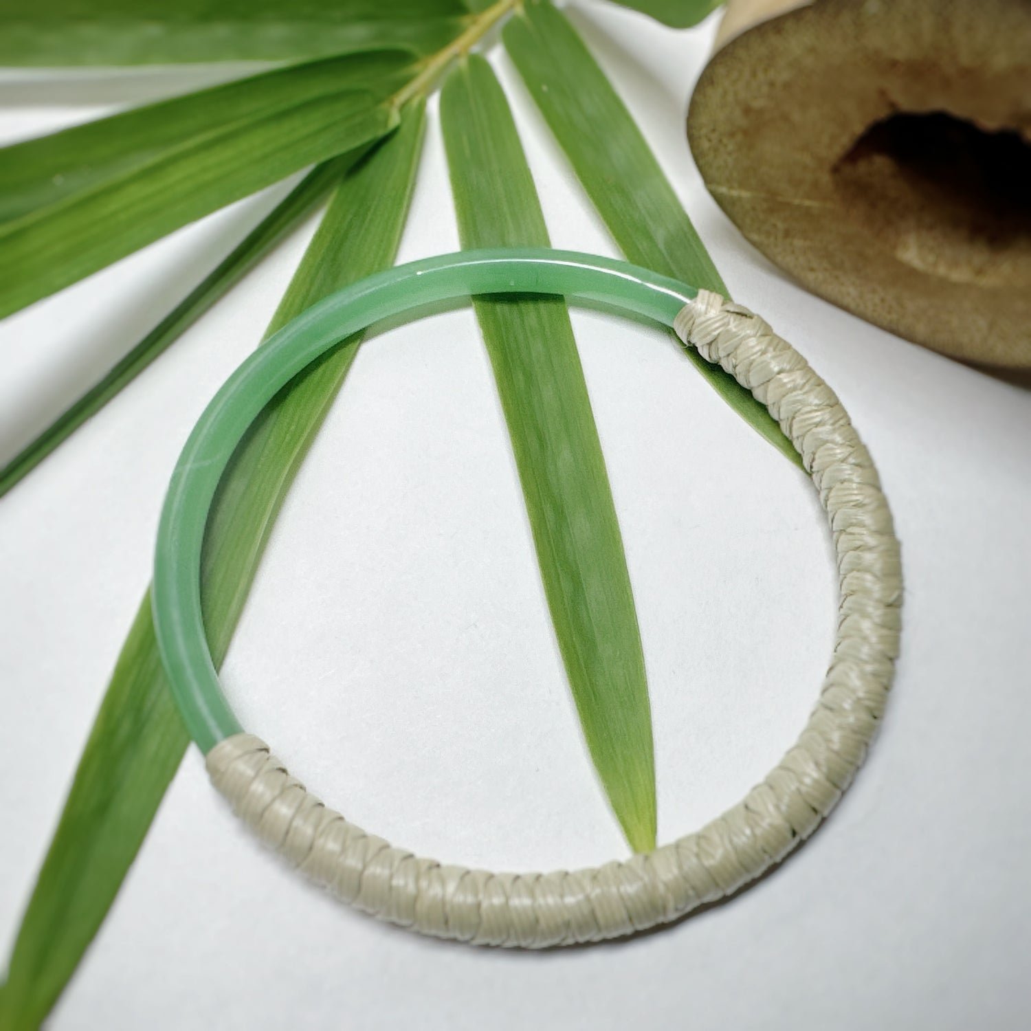 Light green jade 5mm size 8” dainty bangle half wrapped in woven lauhala