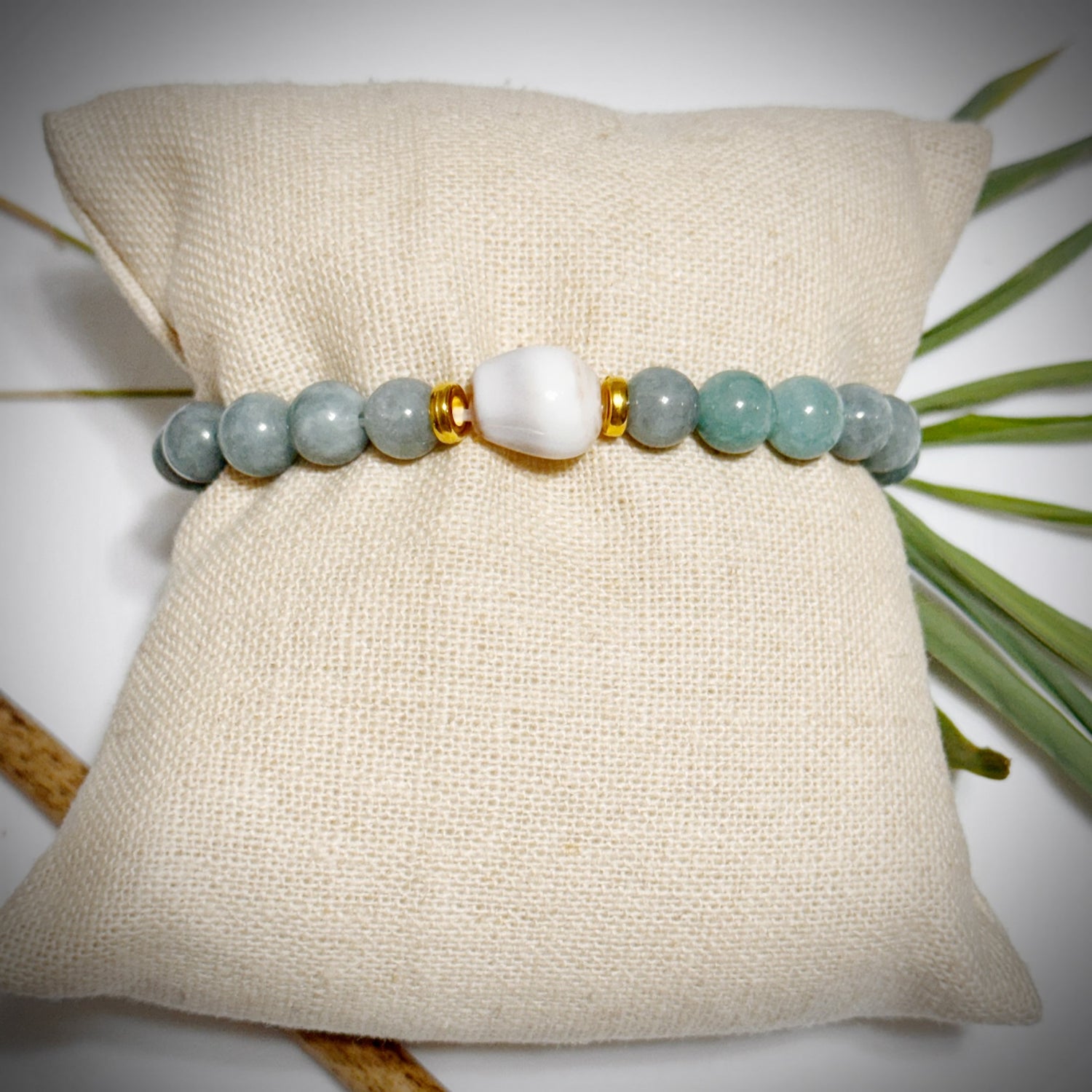 Light cloudy green jade 5mm size 7-7 1/2” bracelet with a cone shell and gold spacers