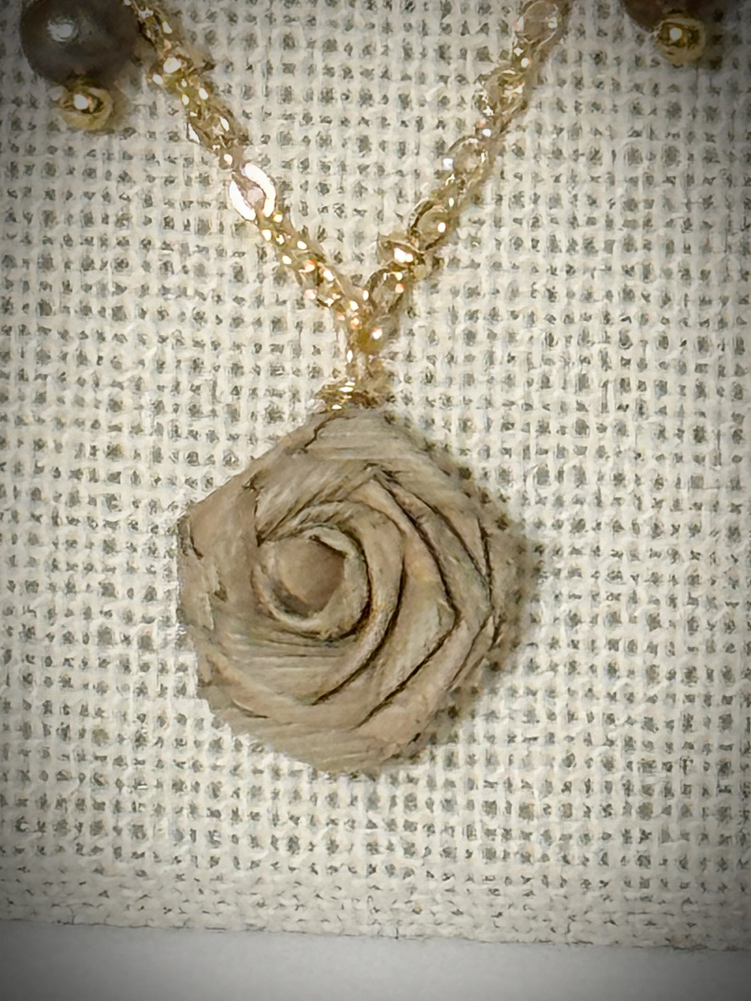 Lauhala 12mm dainty rose pendent on 18” gold chain necklace with 6 tiny golden pearls and matching rose stud earrings