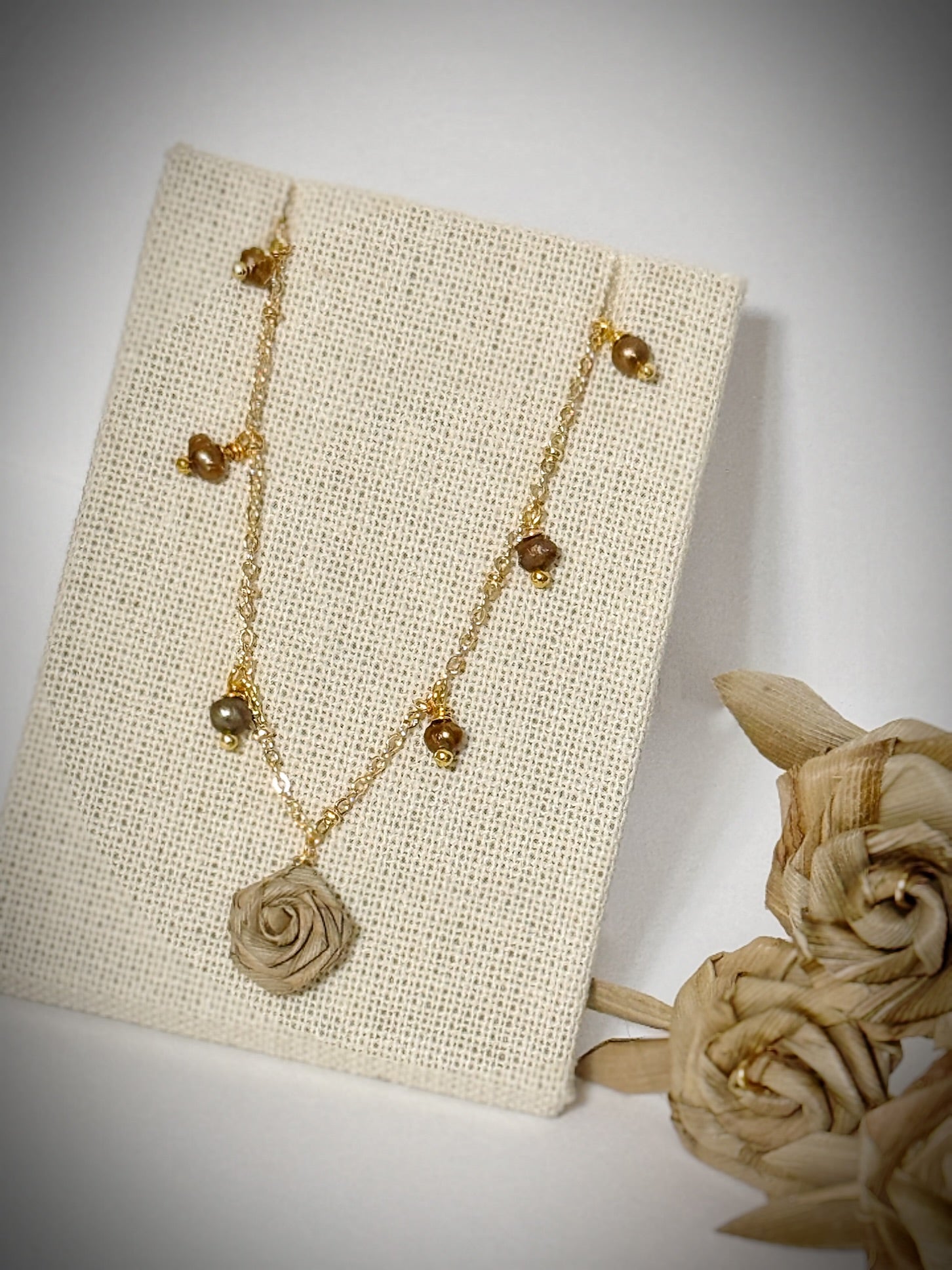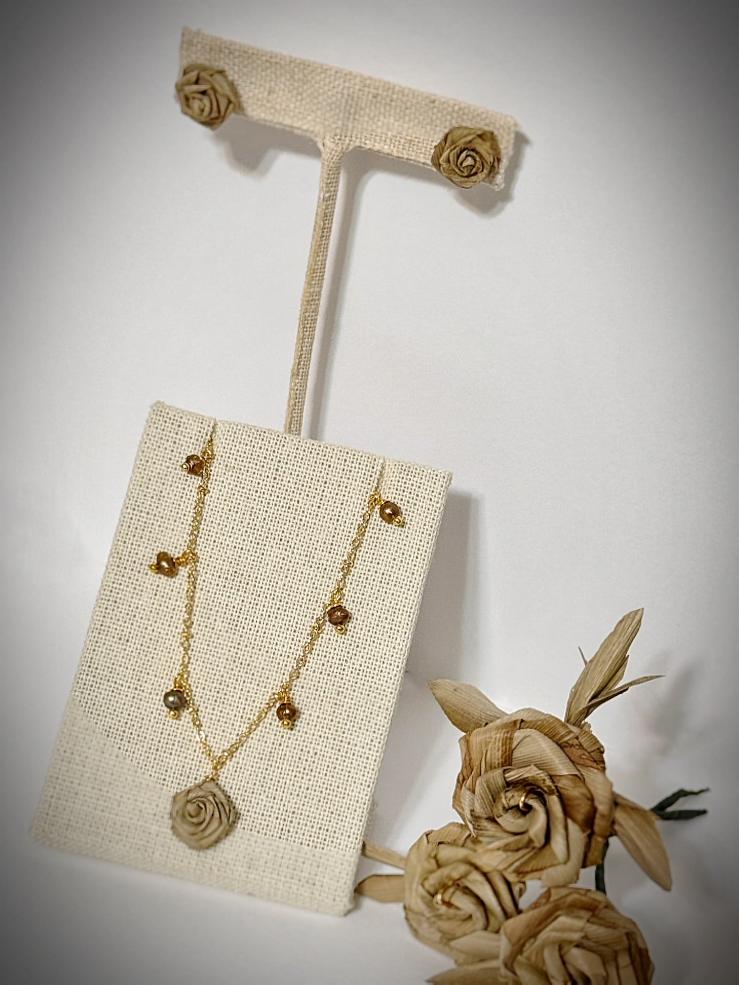 Lauhala dainty rose necklace gold with tiny golden pearls and matching stud set
