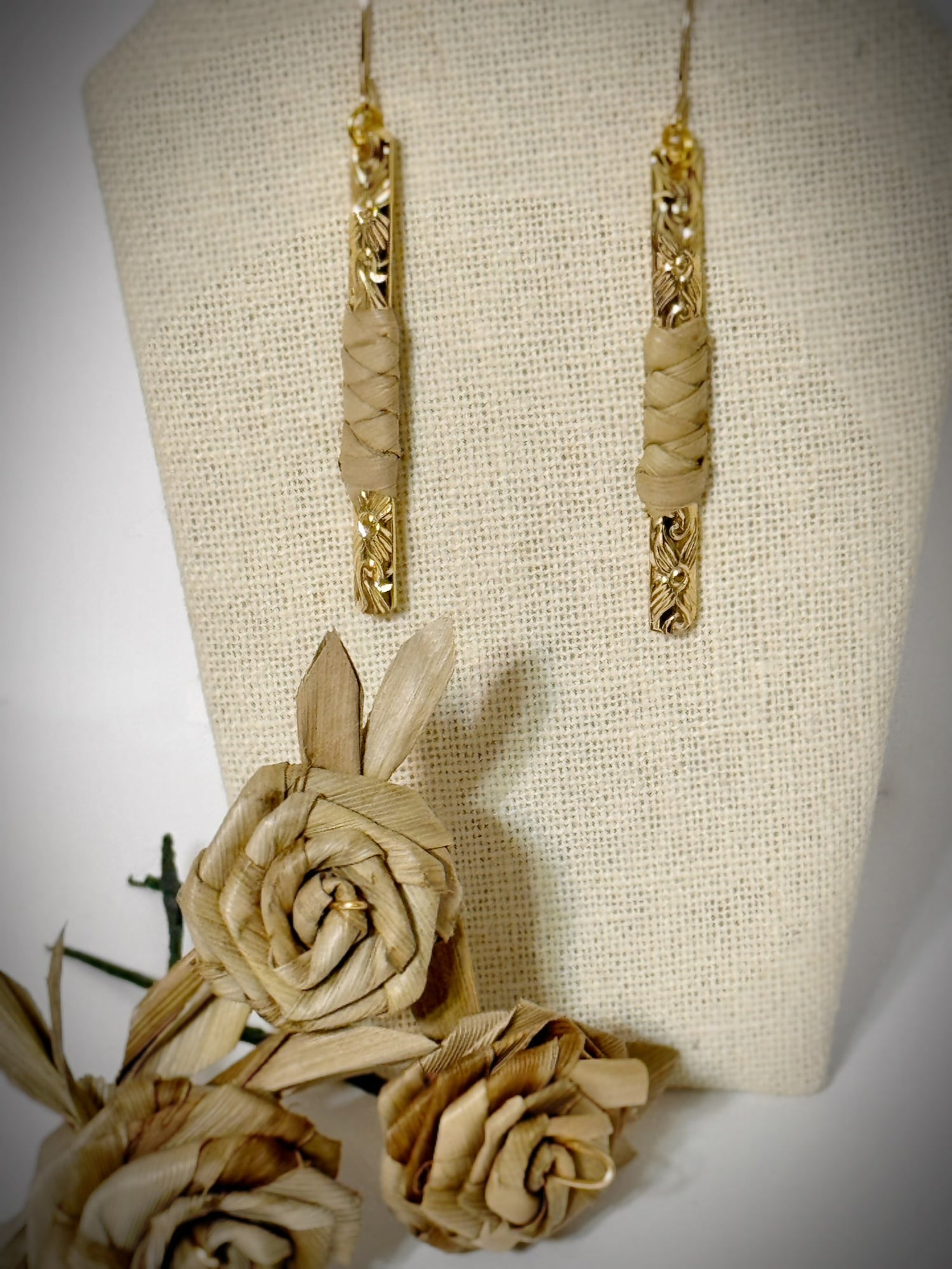 1 3/4” gold hawaiian floral stick earring center wrapped with woven lauhala on gold ear hooks
