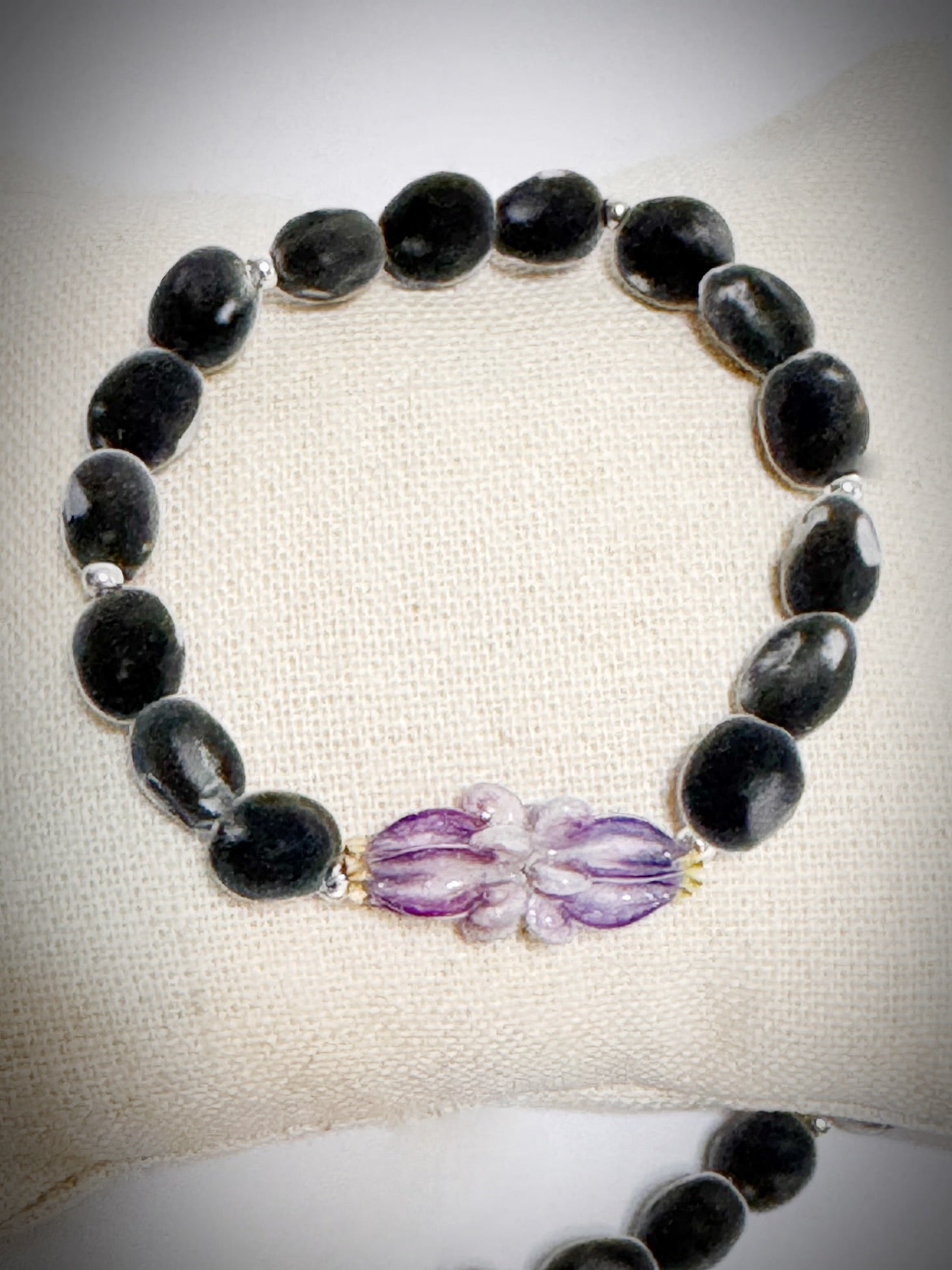 Dark gray Maui mink seed size 8” stretch bracelet with a double pua kalaunu and silver spacers