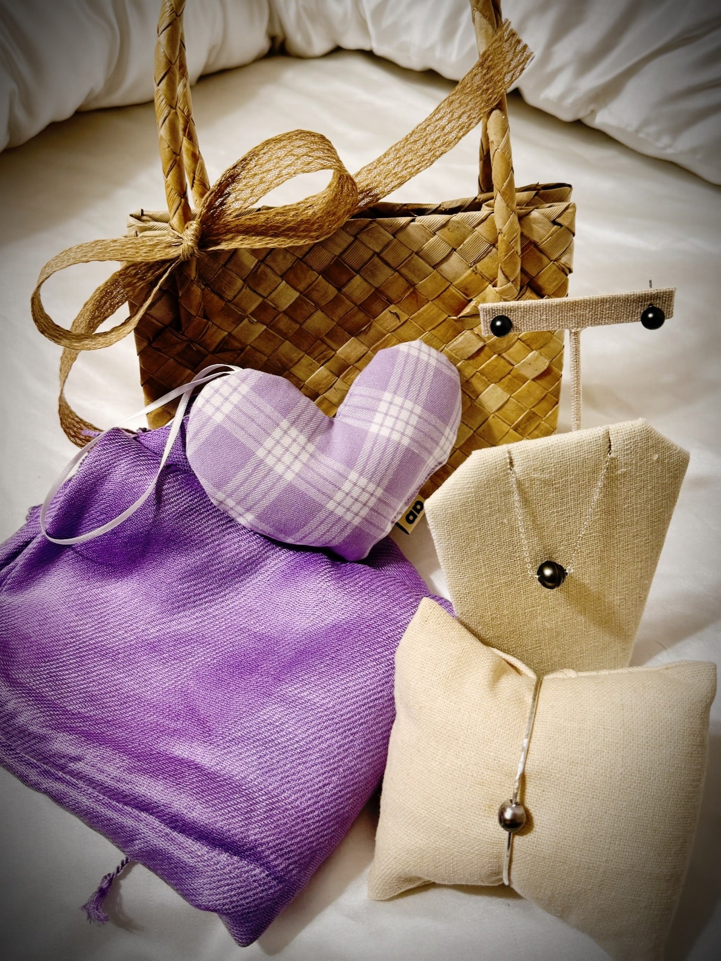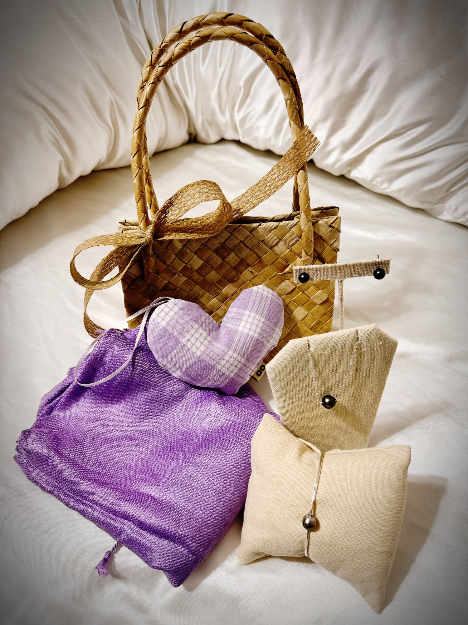 Lavender Palaka gift sets full off all these incredible items…lauhala bag, silk pareo that can also be used as a scarf, Palaka heart ornament, Palaka Pua hair pick, and the perfect imperfect set of Tahitian pearl and sterling silver items.