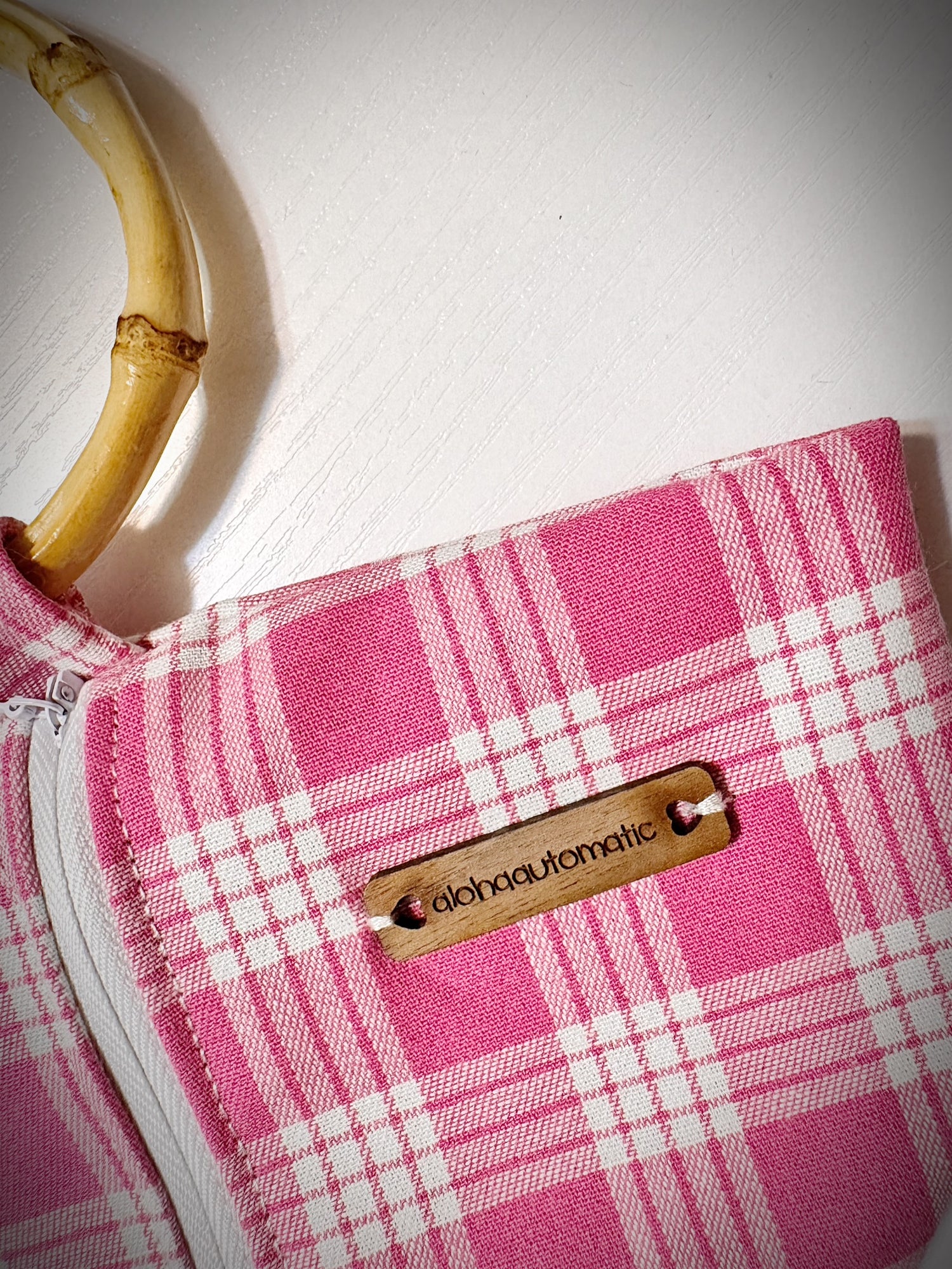 Pink Palaka print zip clutch with a bamboo handle perfect for a young teen to carry her personal hygiene products discreetly to the bathroom at school or your on the go trips enough to fit a phone set of keys and a credit card. This is Pasha’s famous little sack that was donated to middle school girls around Polynesia.