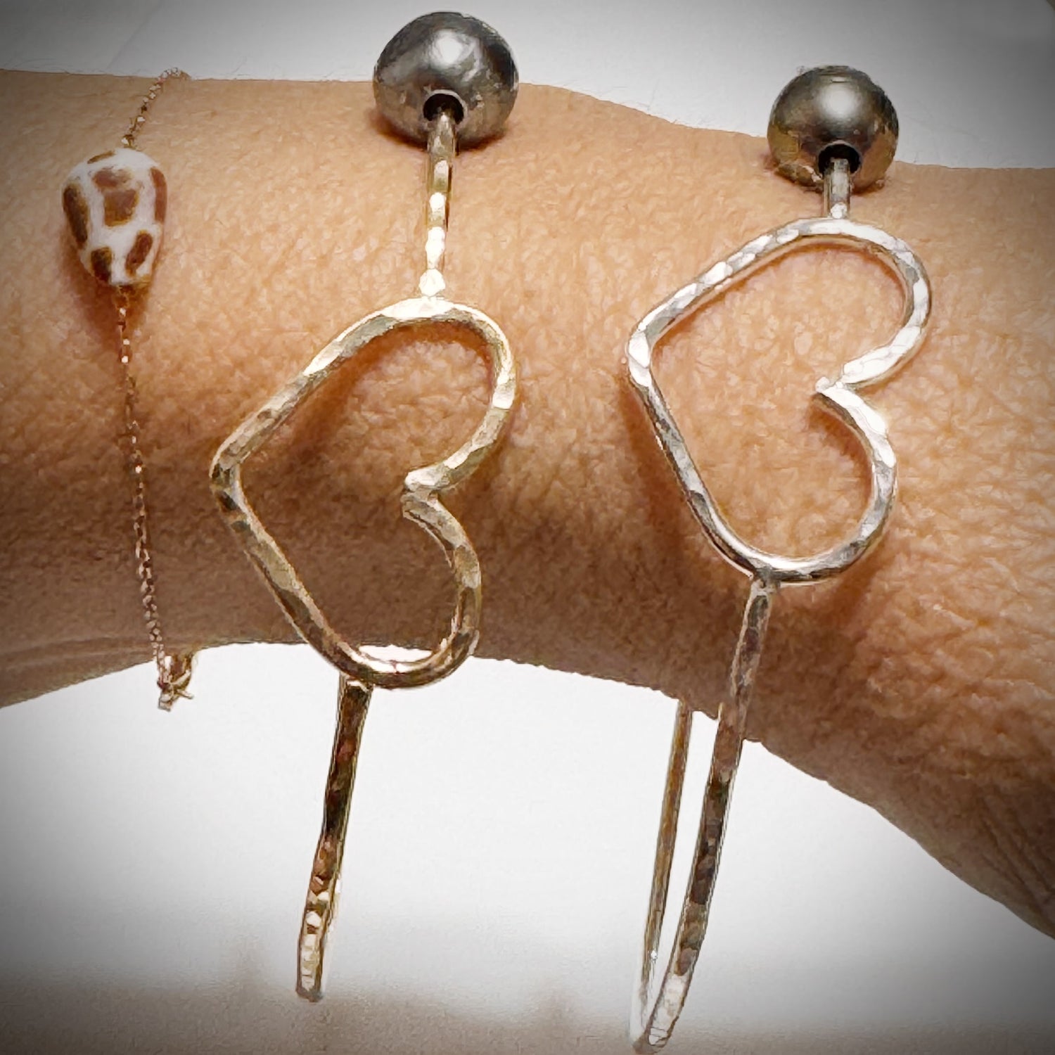 Tahitian black pearl 8mm on gold 14 gauge hammered bangle centered with a pu’uwai for a cute simple look alone or stack with other pieces .