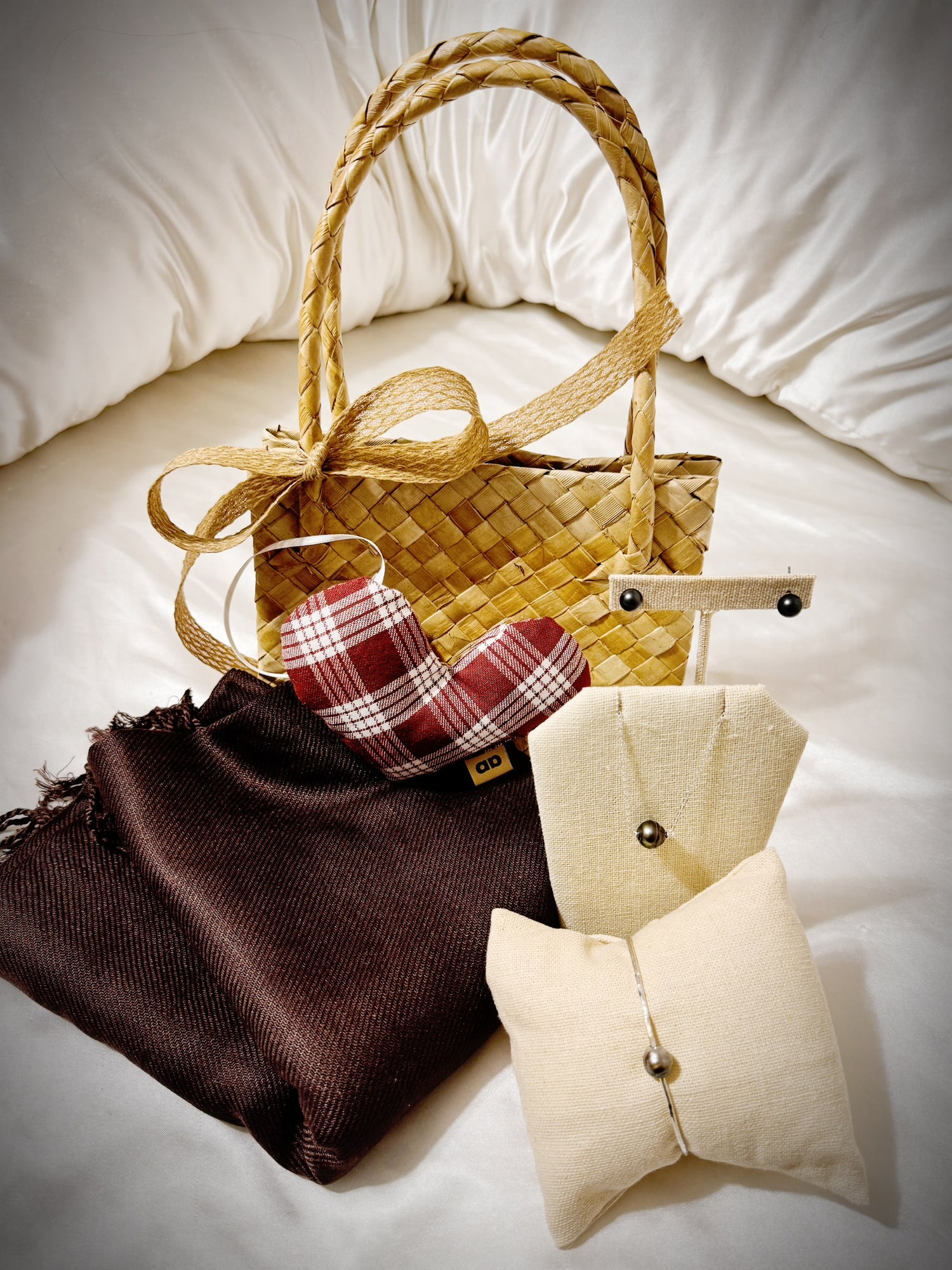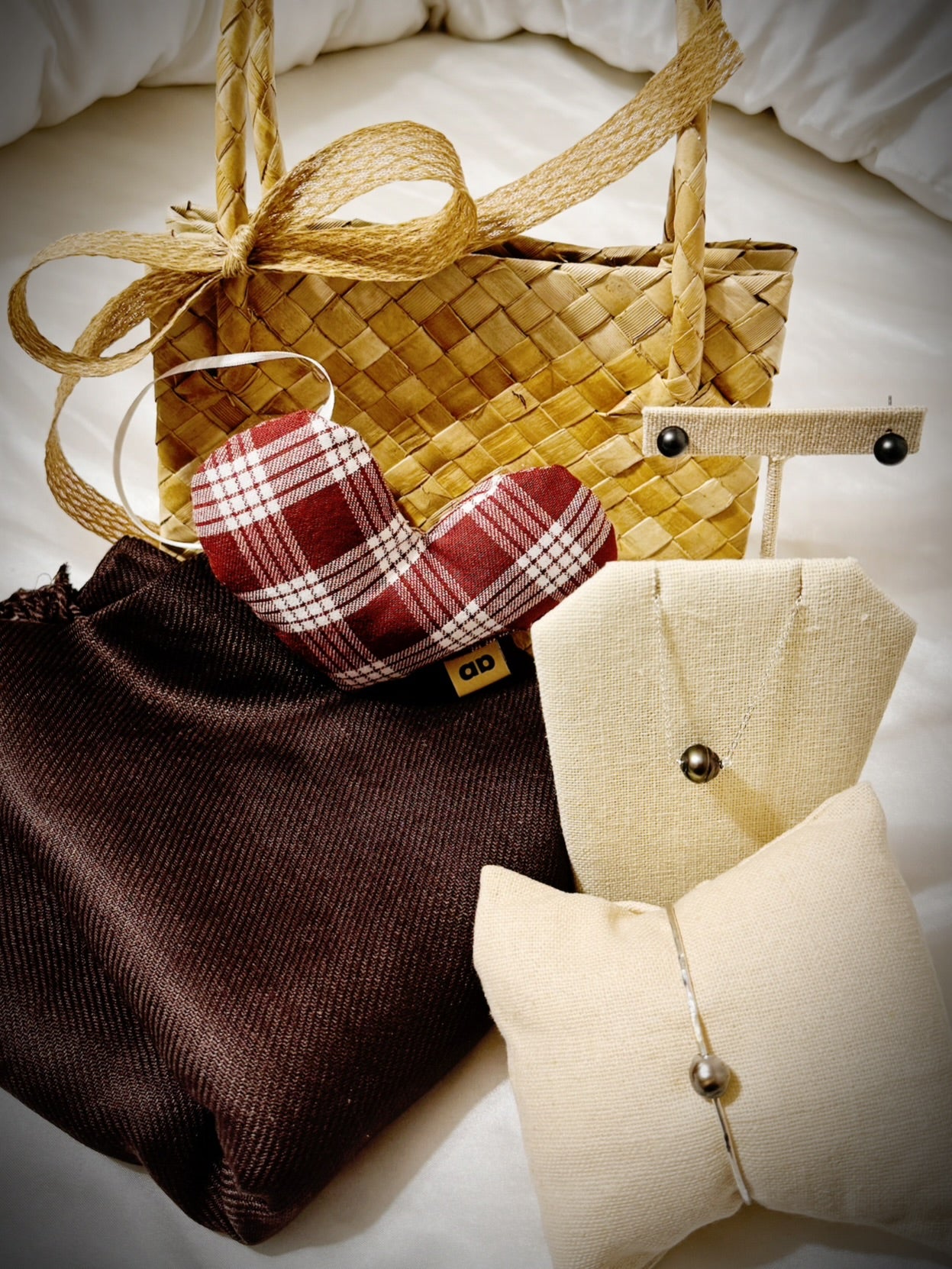 Brown Palaka gift sets full off all these incredible items…lauhala bag, silk pareo that can also be used as a scarf, Palaka heart ornament, Palaka Pua hair pick, and the perfect imperfect set of Tahitian pearl and sterling silver items.