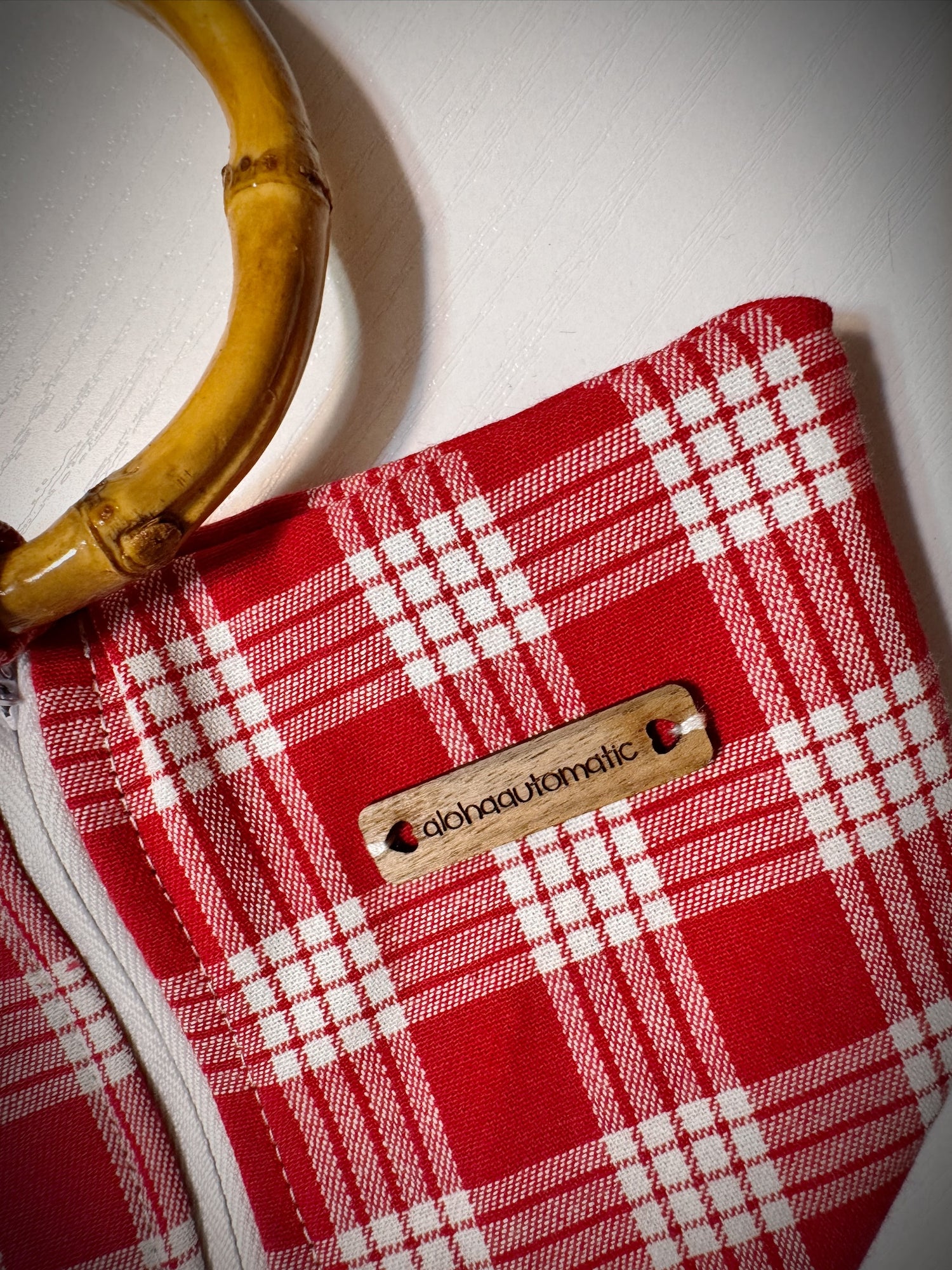 Red Palaka print zip clutch with a bamboo handle perfect for a young teen to carry her personal hygiene products discreetly to the bathroom at school or your on the go trips enough to fit a phone set of keys and a credit card. This is Pasha’s famous little sack that was donated to middle school girls around Polynesia.