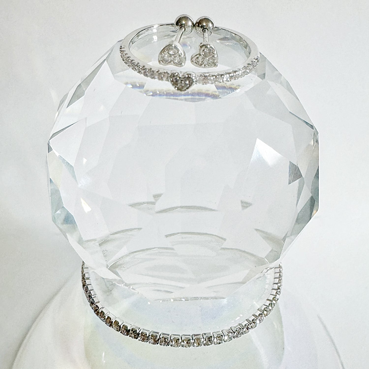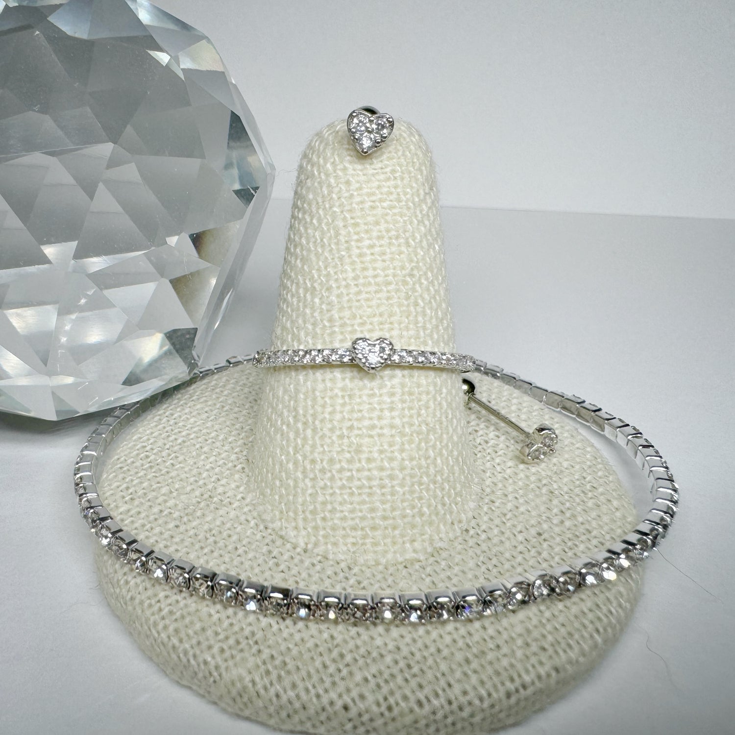This set is a micro diamond like set to give you just enough bling, comes with a pair of micro cluster cz diamonds in a heart with a comfortable post backing stud earring, a micro cz diamond stretch bracelet and a micro diamond with heart ring