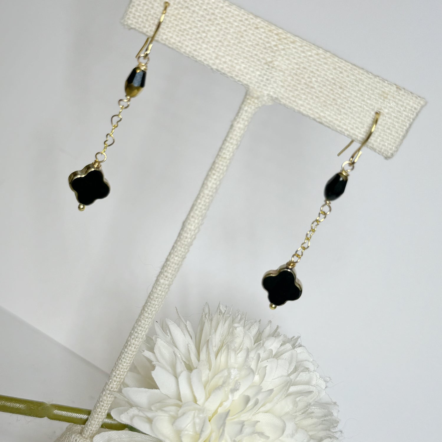 This black resin shape pua clover is coated in gold and strung with additional black and gold beads on both sides on a gold heart linked chain dangle earring