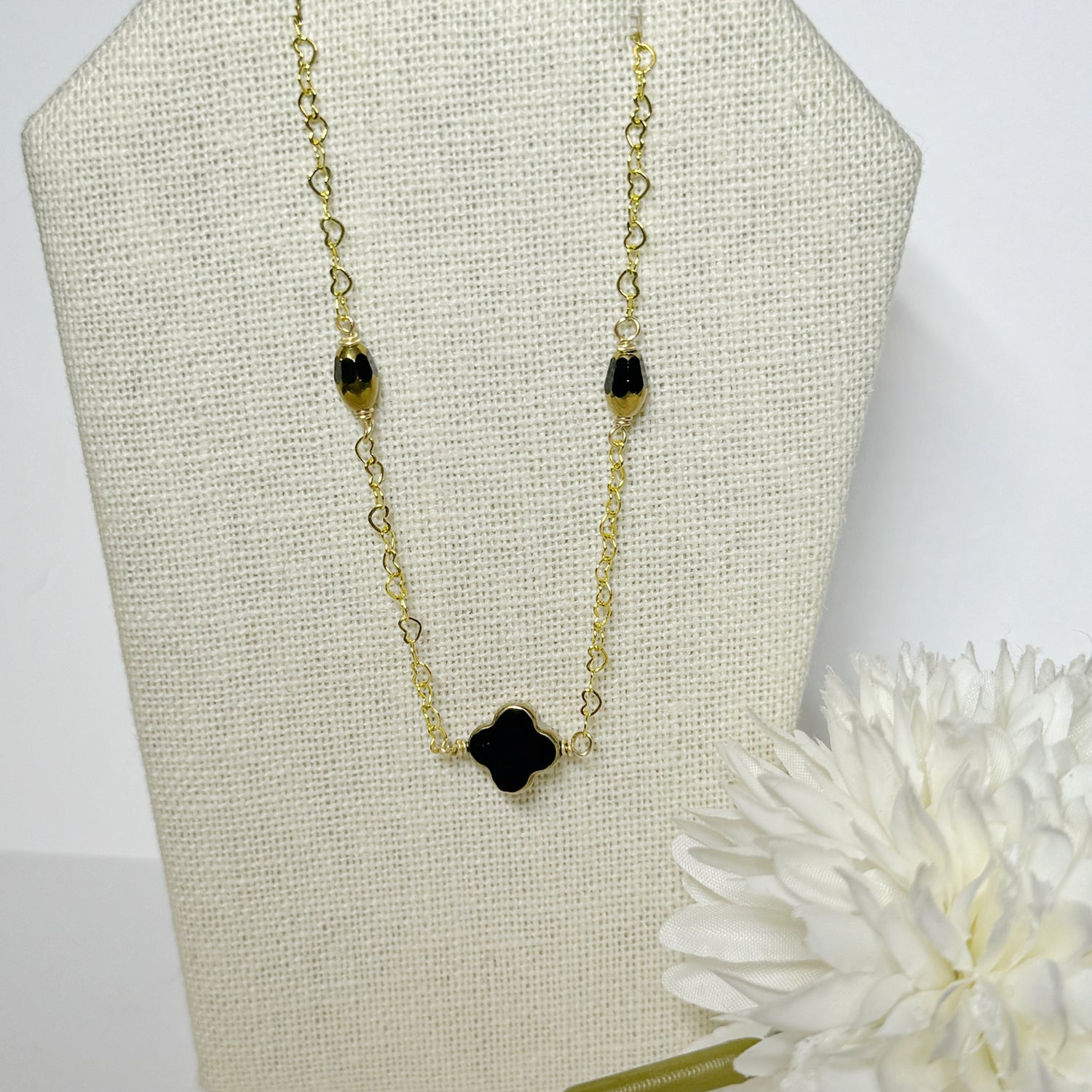 This black resin shape pua clover is coated in gold and strung with additional black and gold beads on both sides on a gold heart linked chain necklace