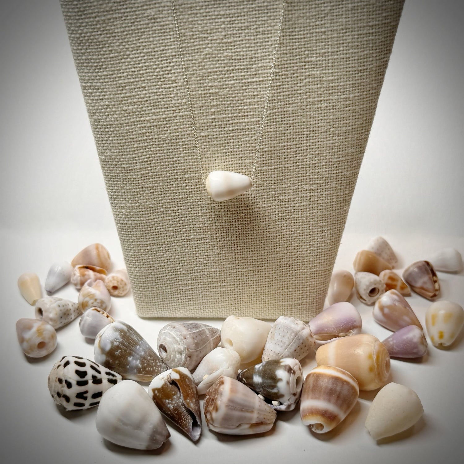 Gray and white Cone 12mm seashell floating on a 17 1/2” silver chain. Perfect for the simple minimalist jewelry wearer’s found on the beaches in Hawaii. Every shell is so beautifully different with its own imperfections.