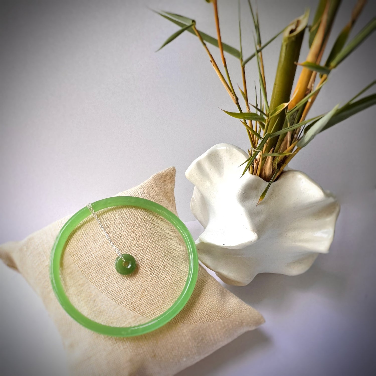 Green jade 5mm size 7 3/4” dainty bangle with a 10mm doughnut shape green pendant on a silver 17“ chain