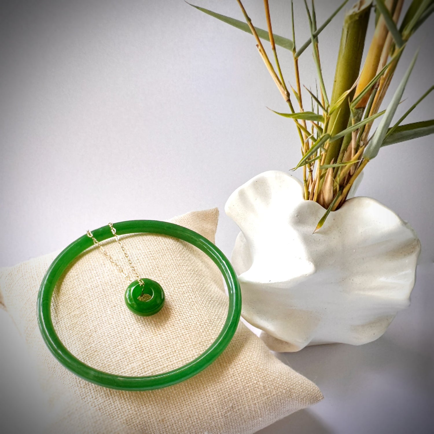 Dark Green jade 5mm size 8” dainty bangle with a 15mm doughnut shape green pendant on a gold 18” chain