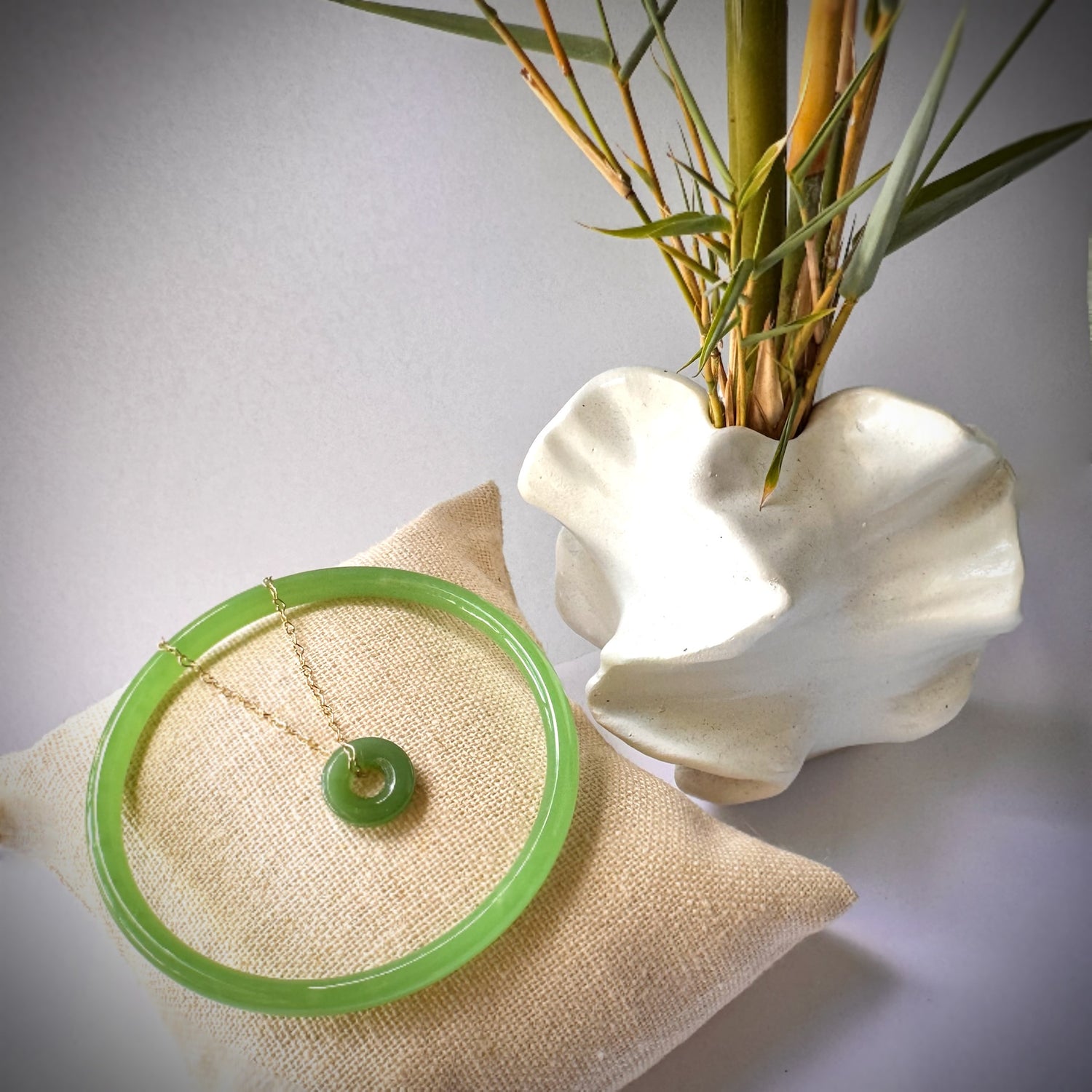 Green jade 5mm size 7 3/4” dainty bangle with a 13mm doughnut shape green pendant on a gold 18“ chain