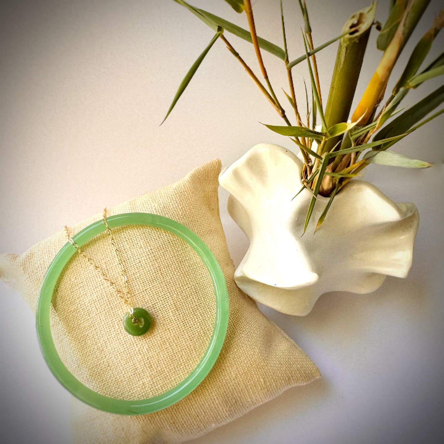 Green jade 5mm size 8” dainty bangle with a 10mm doughnut shape green pendant on a gold 18“ chain