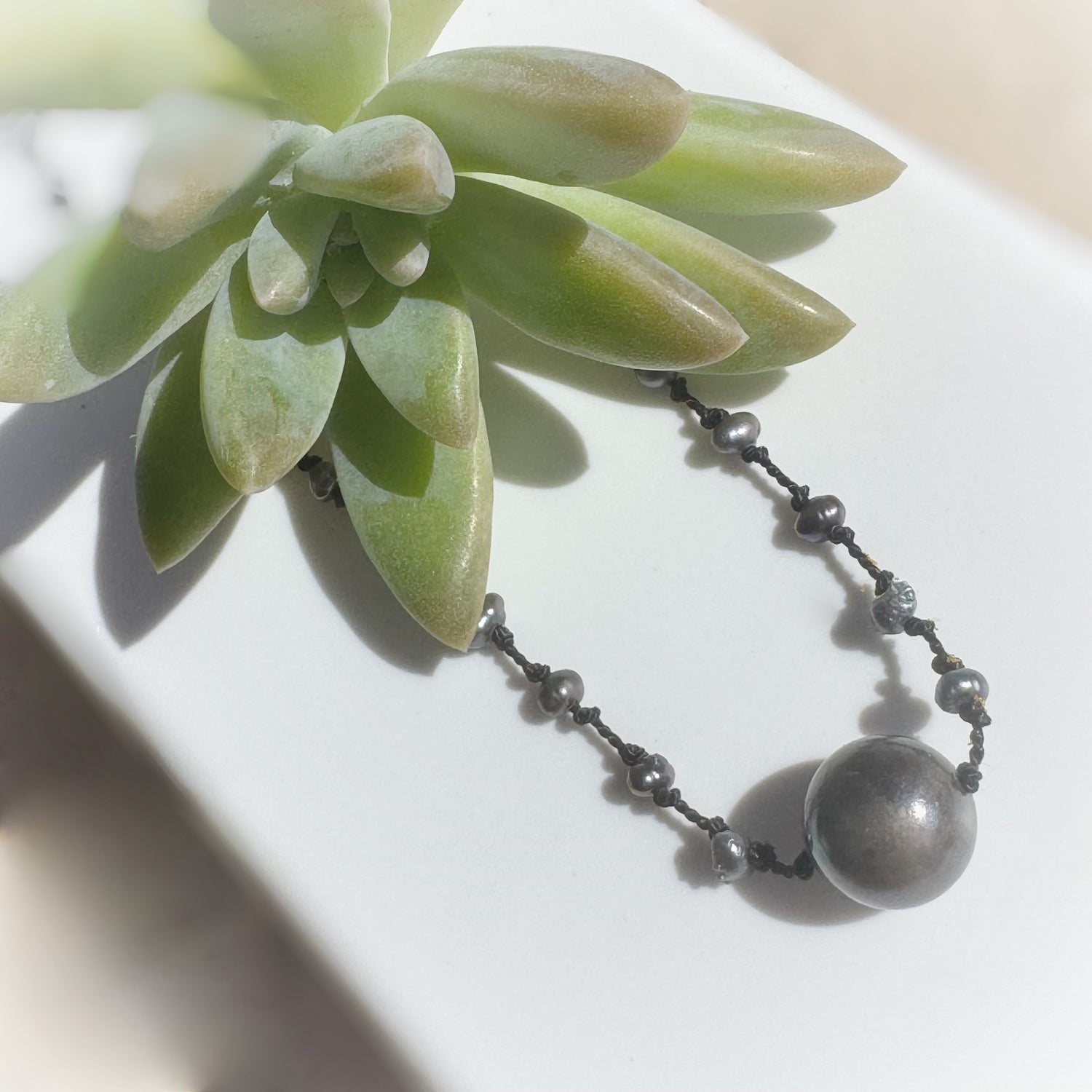 Black rainbow mini freshwater pearls knotted on black silk thread with and extra large 10mm imperfect fresh water pearl choker necklace silver clasp